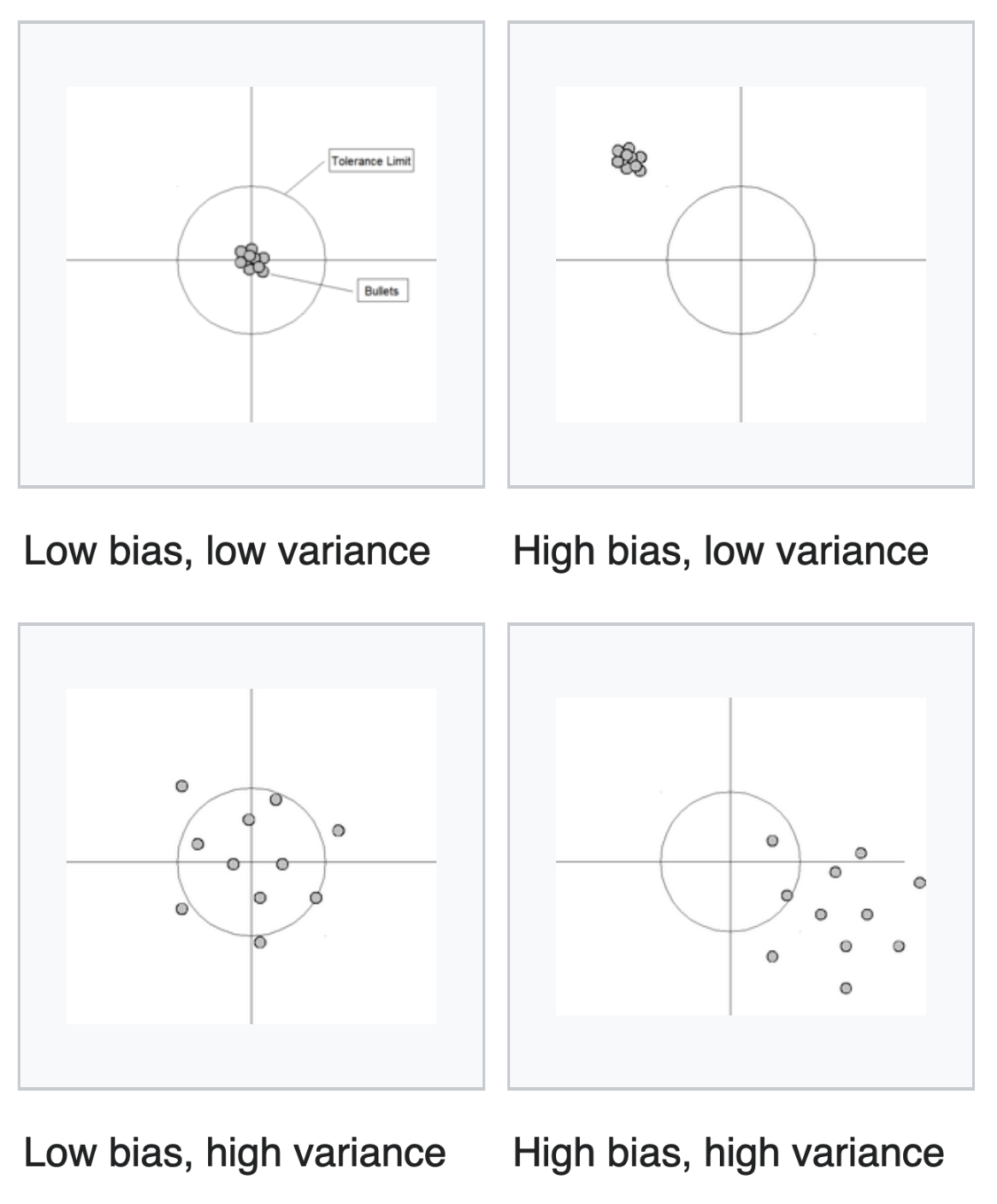 Accuracy-precision becomes bias-variance: drift from truth, tightness of claims. How often should one be right or wrong, and at what cost? The tradeoff claimed between bias and variance: do you enrich your abstraction by giving it more to explain, while risking being unable to define a meaningful central trend as you oversample a population?